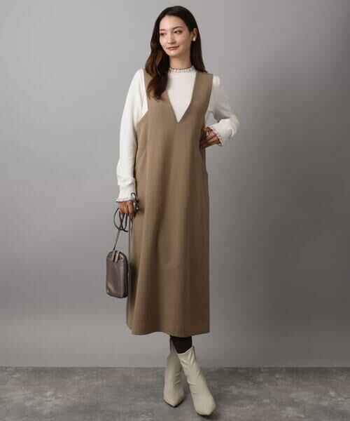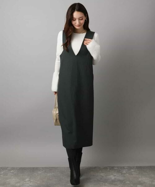 シャープなVネック、すっきりとしたIラインシルエットがきれいなジャンパースカート。ウエスト位置が高く見えるように仕上げたデザインです。アーム部分も広く開いたデザインなので、合わせるインナーを選ばないのも嬉しい。