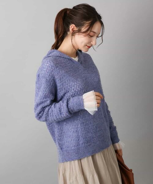 MK MICHEL KLEIN / エムケーミッシェルクラン ニット・セーター | 透かし編みニットフーディープルオーバー/洗える(パープル)