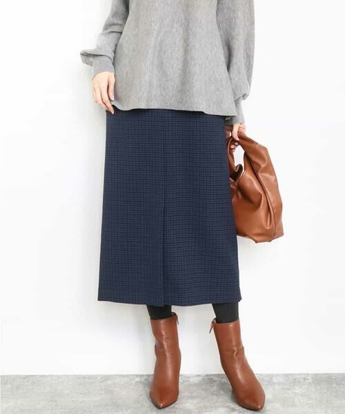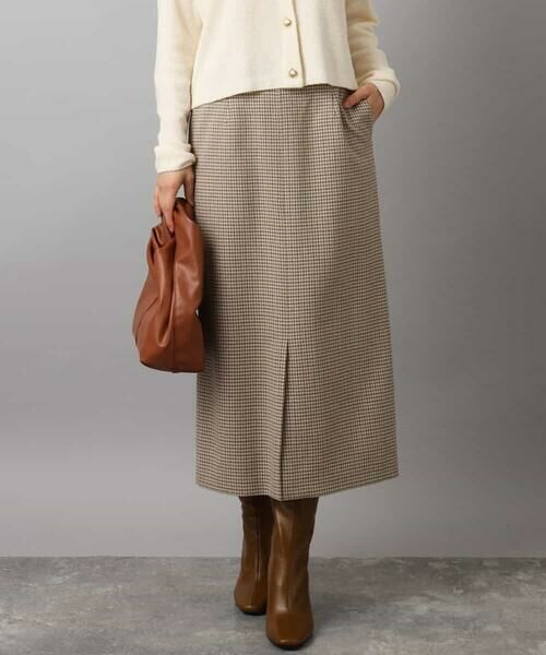 フロントにスリットの入ったデザインのIラインシルエットのスカート。抜け感があり、足さばきの良いデザインです。シンプルなラインがすっきり見えします。ガンクラブチェックの柄もそこまで主張しすぎず馴染み良し。