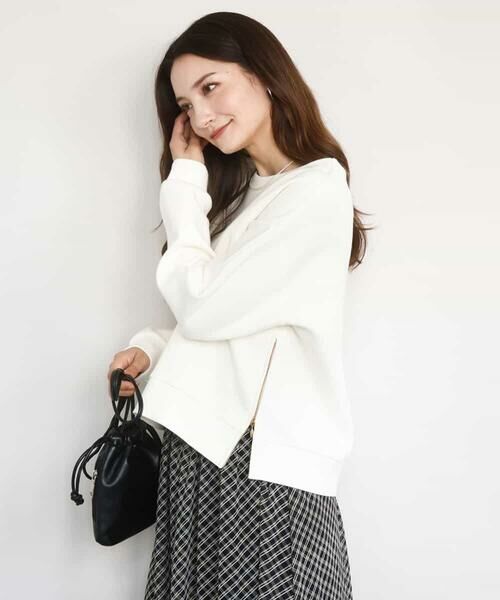 きれいめ素材と衿ぐりの見返し仕様でカジュアル過ぎない仕上がりのプルオーバー。袖にも切替えでカーブを付け、丸みのあるシルエットになっています。左脇の金属ファスナーもデザインポイント。