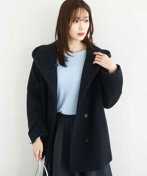 フードの立ち上がりにこだわったフーデットコート。比翼仕立てできれいめにも着こなしやすいデザインに仕上げました。フロントのフード部分が重なるため、釦を全部留めるとより暖かく着こなしていただけます。