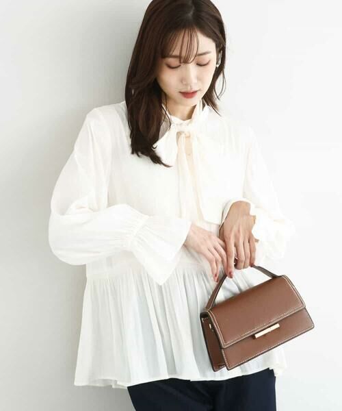 一枚着としてはもちろん、ニットやカーディガンを重ねても楽しめるブラウス。アイボリーは無地、ブラックは大人見えする変形ドット柄の展開です。ウエスト下部分に繊細なギャザーを寄せてデザインポイントに。ヒップが隠れる着丈は安心感も◎ボウタイは取り外し可能。
