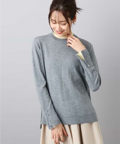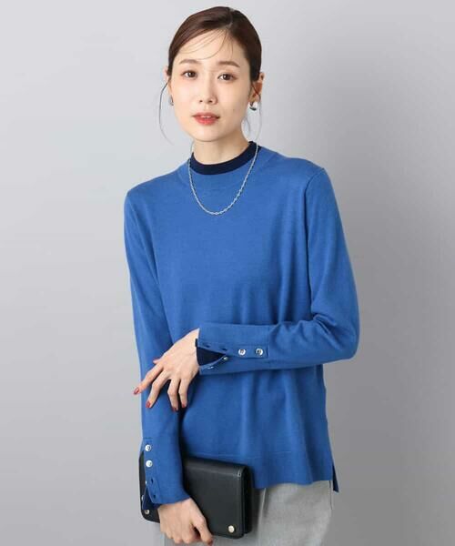 衿ぐりと袖口の配色デザインがポイントのニットプルオーバー。毎年人気のニットですが、今季は衿をやや低めにし、より着やすいデザインにアップデートしました。袖口は配色&メタル釦でアクセントに。釦の開け閉めで見せ方をアレンジできます。