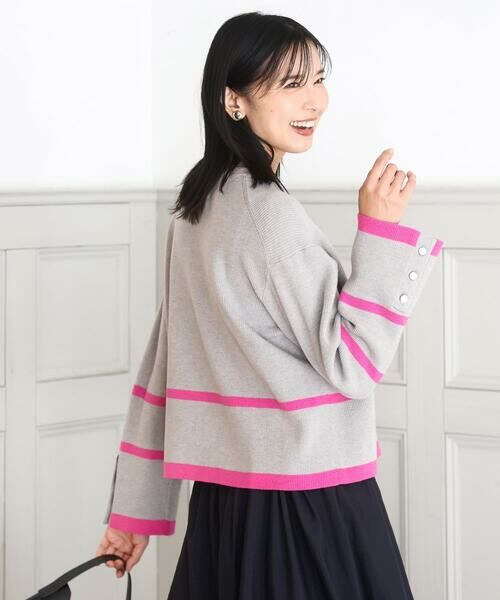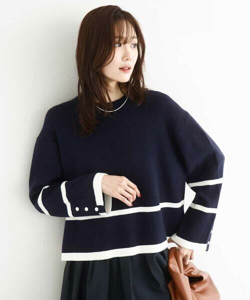 配色ラインと袖口のメタル釦ディティールが目をひくニットプルオーバー。ゆとりのあるシルエットで普段使いしやすい一枚です。