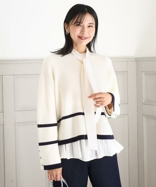 大人のカジュアルコーデにマッチするニットは配色ラインがコーディネートのアクセントに。ゆったりとしたシルエットは一枚着としてはもちろん、例えばインナーにボウタイブラウスやハイネックニットを合わせてレイヤードスタイルも楽しんでいただけます。