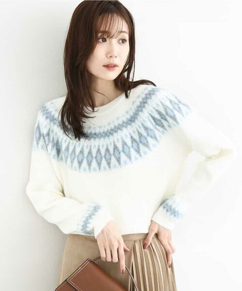 トレンドのノルディック柄が目をひくニットプルオーバー。やわらかなニット素材とモダンな幾何柄がカジュアルすぎずにきれいめに着こなせます。適度なゆとりがあり、求心編みで丸みを帯びた方のシルエットが特徴です。