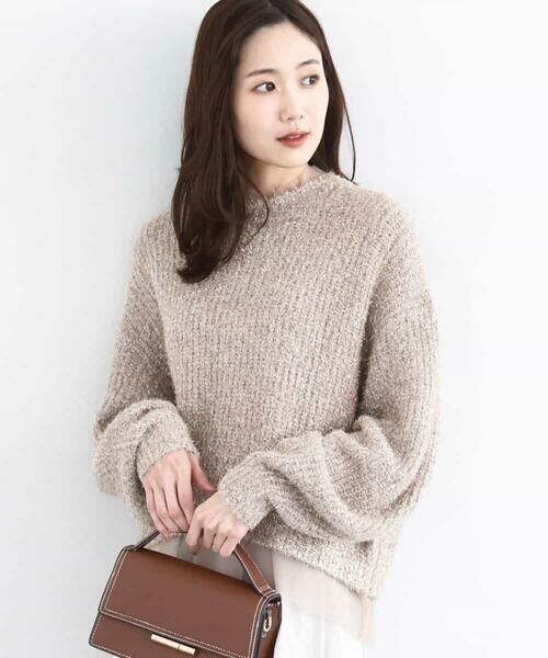 ホリデーシーズンにも一枚で映えるキラキラのラメニット。丸くボリュームのある袖口と、前裾にカーブの付いたラウンドヘムライン。シアー素材のニットフリルを衿と裾に覗かせ、レイヤードしたようなデザインは、甘すぎないバランスに仕上げました。