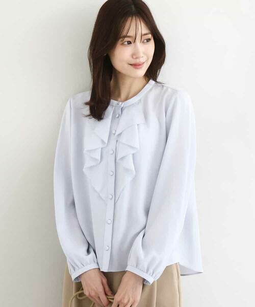 フロントにラッフルフリルをあしらい華やかなデザインのブラウス。ジャケットインしたときにフリルがきれいに見えるように仕上げています。程よいボリューム感のフリルデザインは一枚ではもちろん、ジャケットインしたときにも顔周りも胸元も華やかにしてくれるブラウスです。