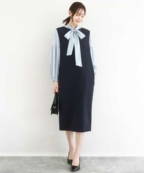 インナー次第で顔の変わるジャンスカは、カジュアルからきれいめスタイルまで幅広く着こなしを楽しめます、後ろのフリルが華やかなので、上品なブラウスと合わせてセレモニーシーンへの着こなしもおすすめです。Vネックのラインは、ハイネックや丸首はもちろん、ボウタイデザインのトップスとも好相性です。