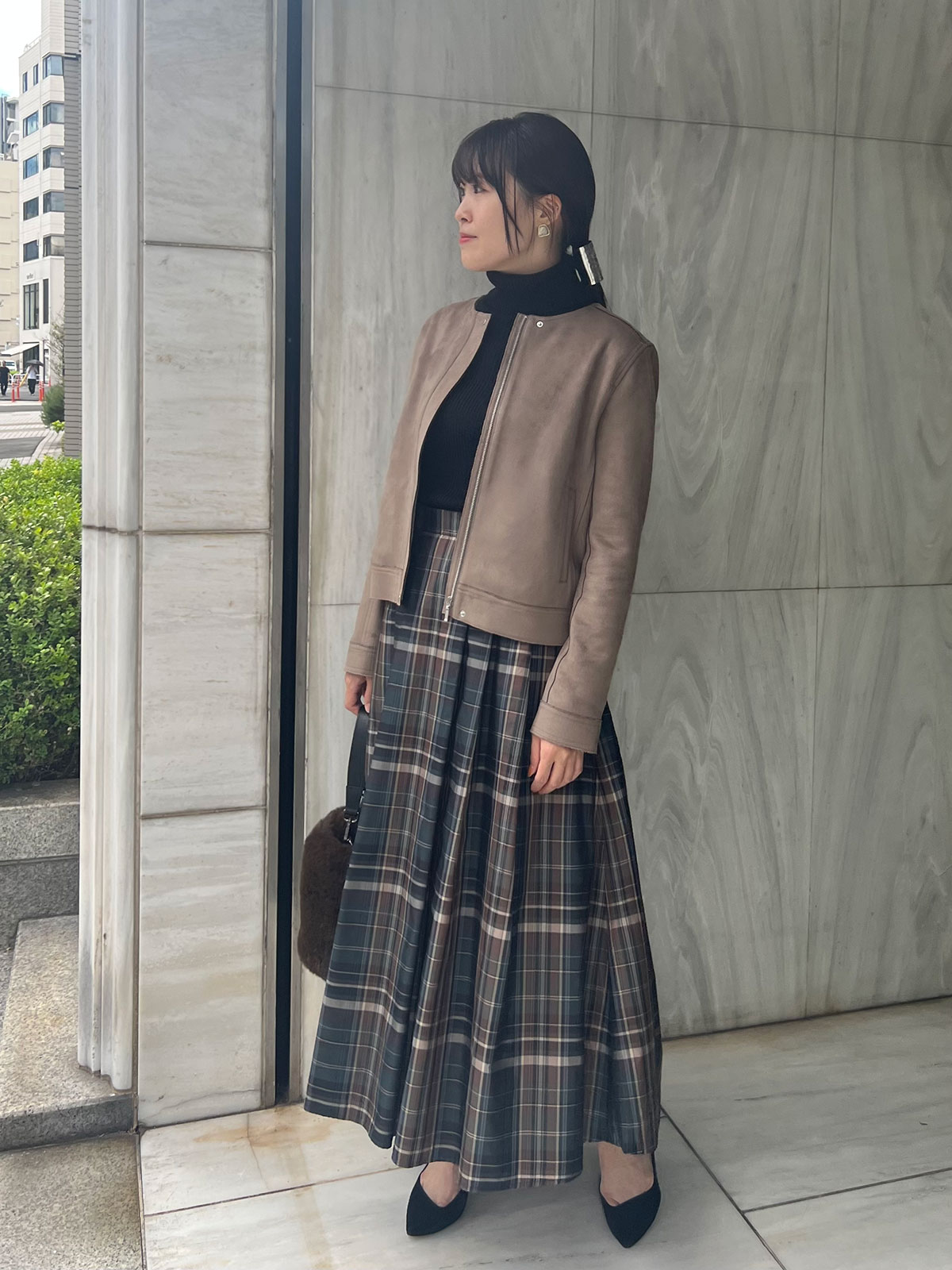 チェック柄×タフタ素材で季節感たっぷりのフレアロングスカート。軽いですがしっかりして透けもないので、秋冬のコーディネートの主役にしたい一枚。程よいボリュームと動いた時の揺れ感が大人可愛い印象に。