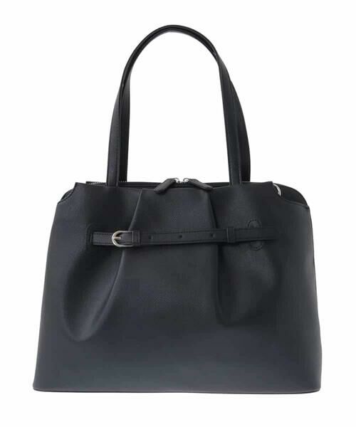 フロントタックで品良く飾ったベルトデザインがポイント。メインはコの字に開くダブルジップ仕様で、中のものが見やすい実用的なお作りです。