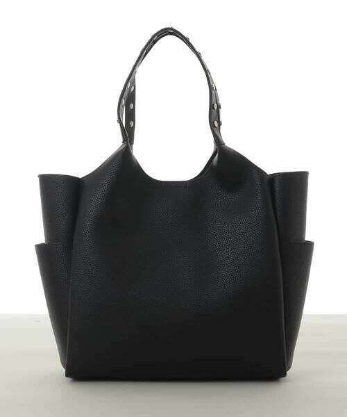 凹凸のある型押し合成皮革に、持ち手のメタルスタッズがグラマラスに煌めくトートバッグです。