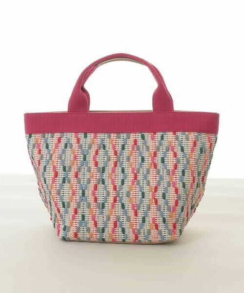 モチーフ編みのカラー配色刺繍がオリジナリティあるピースフルなデザインです。ハンドルやポケット口の合成皮革パーツで、さりげない大人らしさもプラス。