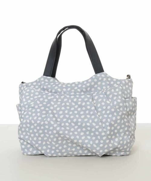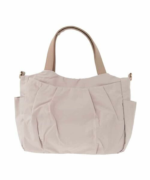 外ポケットにタックを施した、ふっくらとした丸みフォルムが女性らしさを引き立てます。カジュアルな雰囲気ながらも、シックな合成皮革の持ち手をあわせて上品なアクセントをプラス。