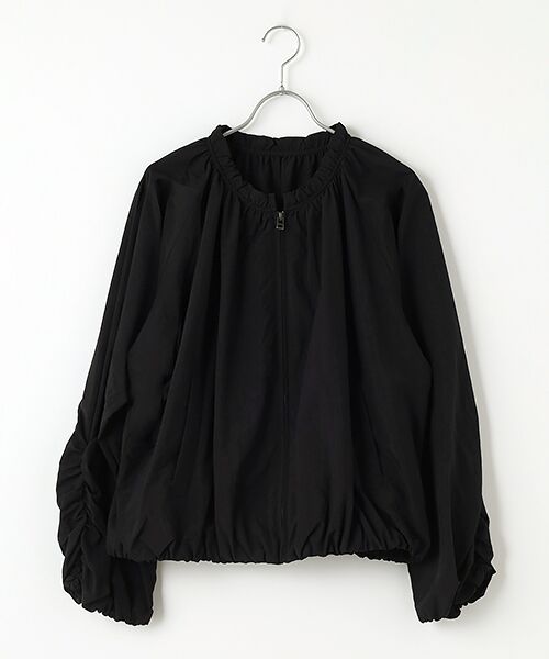 ギャザーをたっぷりと入れたバルーンショートブルゾンです。フロントジップでエッジを効かせ、ギャザーを寄せた衿はスッキリとクルーネックに。たっぷりとしたフォルム感のある袖にはパッカリング調のシャーリングが華やかさをプラスしています。袖口はゴム仕様なので捲ってラフに着ることも出来ます。
