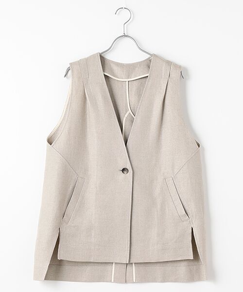 後ろの見頃が前に重なったような切り替えがポイントのジレ。肩に入れたタックが表情を付け、ステッチを効かせて程良くカジュアルダウンしているので、ニットやブラウスともかっちりし過ぎず合わせやすくなっています。あえて長くポイントにしたベンツはボタンを開けてアレンジも可能です。テープ×スラリットテープのニットトップス、ヴィンテージビスコースツイルのパンツとのコーディネートがオススメです。