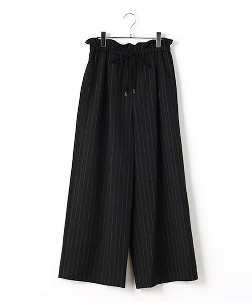 【素材】 麻が少し入った、ナチュラルで清涼感のある素材。手触りが柔らかく、程よい落ち感があります。ポリエステル高混率なのでしわにもなりづらいです。【デザイン】上端がフリル状になった、イージーワイドパンツ。紐入りで調整可能。ボリュームのある形で着ごたえのある、着映えするデザイン。クールな印象のピンストライプで、シンプルなトップスと合わせるだけで決まります。