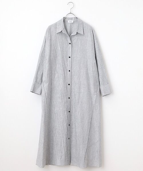 首元をスッキリと見せてくれるスキッパータイプのシャツワンピース。前振りした脇線から広がるフレアーシルエットで、タックのアクセントを付けています。後ろ切り替えにはたっぷりとギャザーを入れ、バックコンシャスなフォルム感のある一着になっています。厚みのあるクリアーなブラックのボタンがポイント。