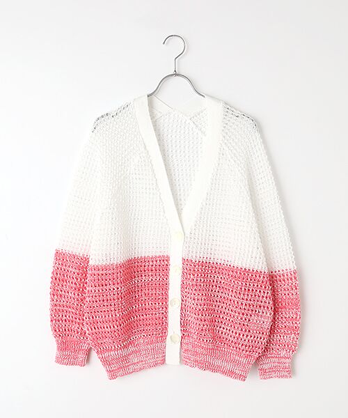 【素材】ハリ感のあるテープヤーンと軽く透け感があり、柔らかく発色がきれいなスラリット糸を掛け合わせたバイカラーニットです。清涼感のある糸と編地はとても軽量です。【デザイン】Vカーディガン。テープヤーンで透かし柄を編み立て、裾と袖口周りにスラリット糸を引き揃えてカラー配色をデザインポイントにしています。※目の大きき編み組織ですので、引っ掛けに注意してください。