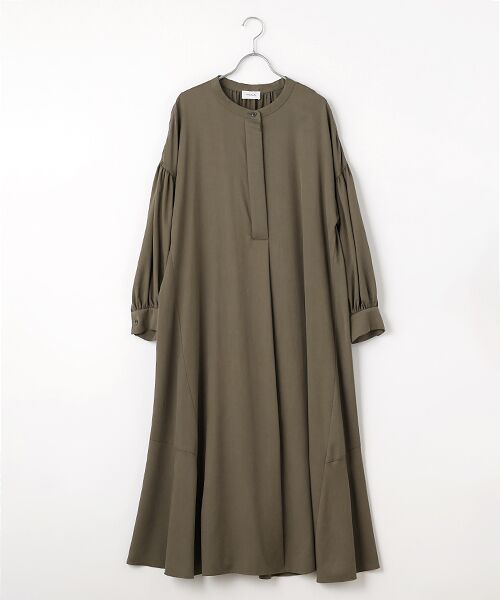 抜け感のある衿ぐりは前明きで調節可能。脇線を前振りし、身頃は程よくスッキリ見えながらヘム切り替えのフレアーで変化を付け、流れるような女性らしいシルエットに。