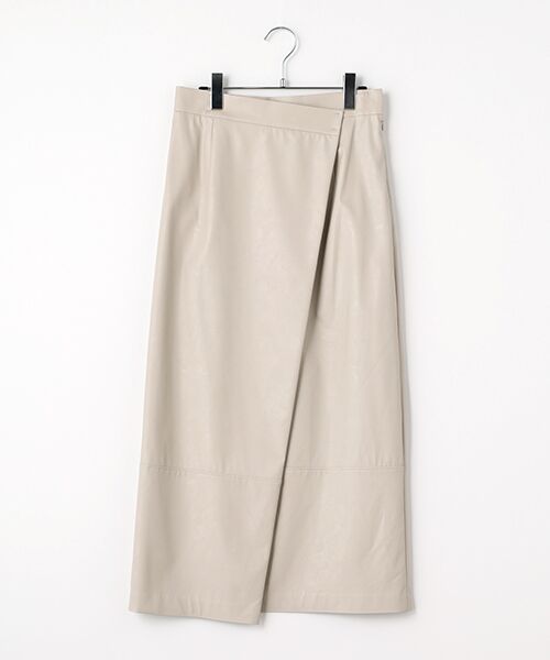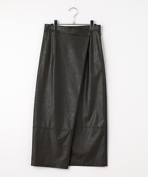 【素材】ヴィスコースのベースにより柔らかくライトウエイトに仕上げた湿式合皮です。風合の柔らかさに優れ、見た目の高級感を表現した素材です。【デザイン】ラップ風のアシンメトリーなディティールが特徴のIラインスカート。リアルレザーのような切り替えをアクセントにしています。ラップの内側にはスリットを入りで足捌きも良く、スタイルアップシルエットのスカートです。シャイニーダブルクロスのブルゾン、ブライトエアーポリ、ストライプのブラウスでバランスよくコーディネートしていただけます。