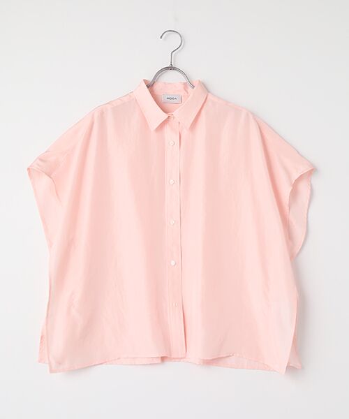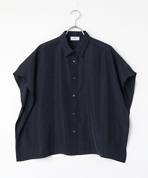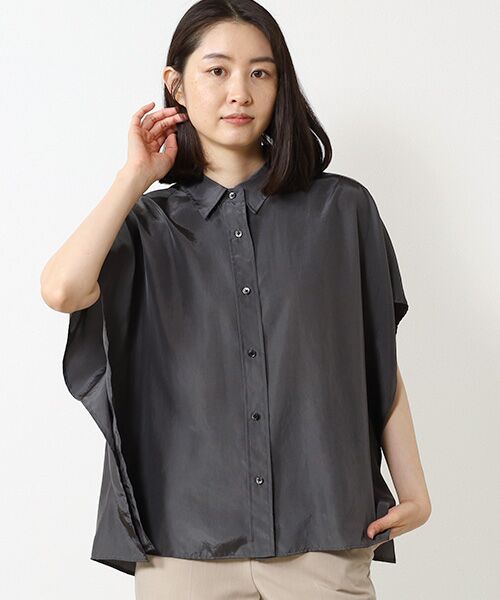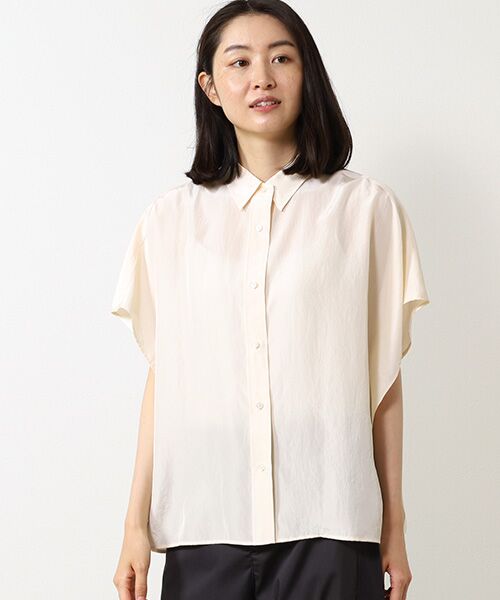 1枚着で映えるケープシャツです。暑い日にはサラッと羽織っていただけるアイテムです。二の腕を強調しないデザインになっており、アームホールがない設計なので汗染みも気になりにくいです。サイドにはケープならではのドレープ感がアクセントに。襟や前立てはしっかり決めているので、緩くなりすぎないキレイめな見え方です。