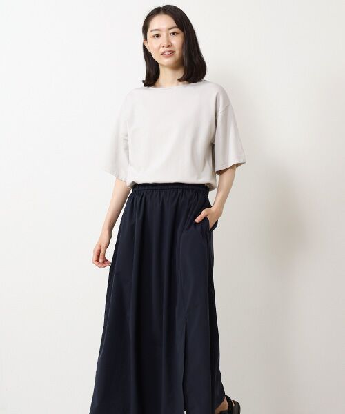 長めのスカートの片サイドにベンツスリットをあけて動きにアクセントをつけています。ウエストに入れたタックとスカートの分量感も着用のシルエットがスッキリめに美しく見えるように仕上げています。
