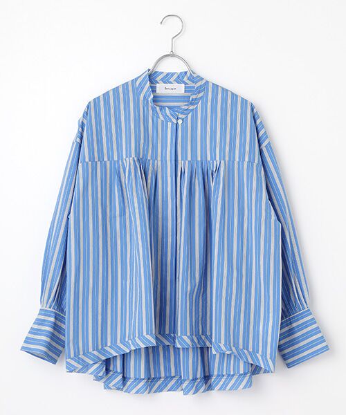【素材】ナイロン混で生地の表面に細かなしわのようなビンテージライクな表情のある素材です。マルチストライプもシックで着やすいカラーになっています。【デザイン】一枚で着映えするAラインブラウス。細かなタックを入れたり、襟や裾にバイアスの切り替えを入れたり、細部にもこだわりが詰まったブラウスです。前丈は短めで前後差のあるシルエットで、ワイドパンツやタイトスカートとバランスよく合わせられます。
