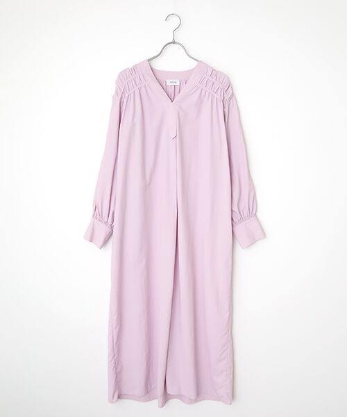 抜け感のあるVネックのスキッパーにふんだんに取り入れたギャザーとシャーリングがポイントのIラインワンピース。ギャザーは共生地のテープでボリュームを抑え、立体感のあるメリハリを出しています。程良く体離れするシルエットでボリューム袖とのバランスが良い1枚です。