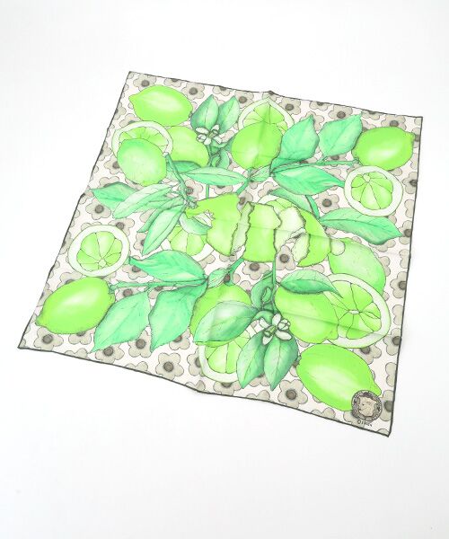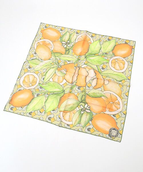 Citrus(シトラス):夏の柑橘類のフレッシュな香りと味覚をテーマにしたデザインです。レモンやライム、オレンジの爽やかな感覚が、季節の思い出を蘇らせます。ほんのりとした優しい色使いが上品なフルーツモチーフのスカーフです。ベースにはフラワー柄を使用した、遊び心も光るデザイン。ポイントカラーでトリミングを施し、印象をグッと引き締めました。アレンジ力の高い、程よい大きさも魅力的です。