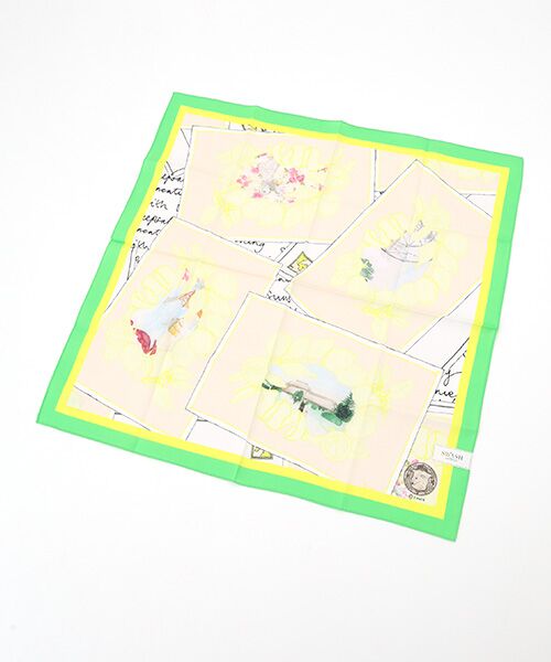 ポストカードは時間の断片を切り取り、一瞬の輝きを捉えるものです。まるでシルクのスカーフがそうであるように、その瞬間は永遠にイメージとして保存されます。ノスタルジックでありながらも新鮮な感覚を呼び起こします。ポストカードを並べたような、ドラマティックなデザインが魅力のハンカチです。ビビッドカラーでトリミングすることで、全体をグッと引き締めました。サラリとしたタッチが心地良い、コットンサテン素材です。大き目のサイズ感で、スカーフのように使用するのもオススメ。