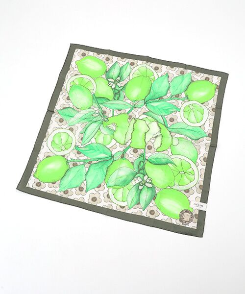 Citrus(シトラス):夏の柑橘類のフレッシュな香りと味覚をテーマにしたデザインです。レモンやライム、オレンジの爽やかな感覚が、季節の思い出を蘇らせます。ほんのりとした優しい色使いが上品なフルーツモチーフのハンカチです。ベースにはフラワー柄を使用した、遊び心も光るデザイン。ポイントカラーで縁を切り替えることで、プリントがグッと際立ちます。アレンジ力の高い、程よい大きさも魅力的です。