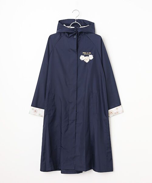 胸元や袖口、フード裏などにフェミニンなフラワーをあしらったレインコート。ロングスカートにも合う丈感でスタイリングに馴染む1着です。シックなネイビーの他には明るい色を揃えていて、軽やかに着ていただけます。愛らしい猫のポーチ付きで、持ち歩きやすいのも魅力です。
