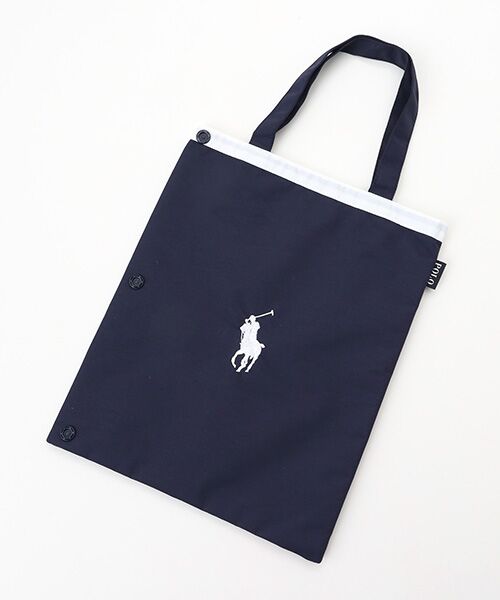 「POLO RALPH LAUREN」の吸水機能付きのトート型傘袋。ブランドシグネチャーのワンポイントと同色のトリミングを効かせたシンプルでトラッドなデザイン。オシャレなトートバッグのようなルックスですが、スナップボタンを留めればスリムな折りたたみ用の傘袋にチェンジします。裏側に吸水加工生地を使用しているので濡れた傘の水滴を垂らすことなく、バッグの中の水濡れをガードします。