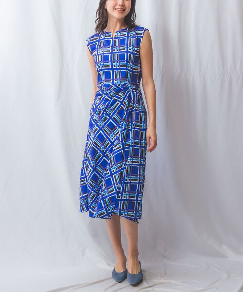 大胆なカラーが目を惹くチェック柄のワンピースです。スリット入りのキーネックやコンパクトなスリーブが爽やかな抜け感を演出。柔らかくしなやかな素材を活かして、ウエストとサイドにドレープデザインを入れています。軽さとストレッチ性がありストレスフリーな着心地。ボディラインに沿うような美しいシルエットと揺れる動きのあるスカートディテールで、フェミニンな装いに決まる1着です。・カラー展開はグレー、ブルー・サイズ展開は1(M)9号・3(2L)13号
