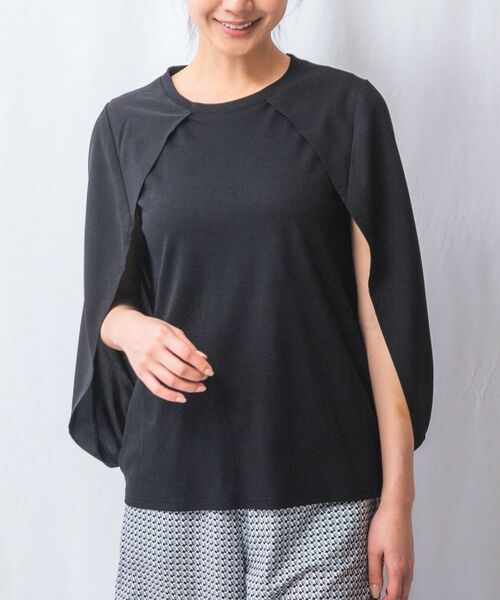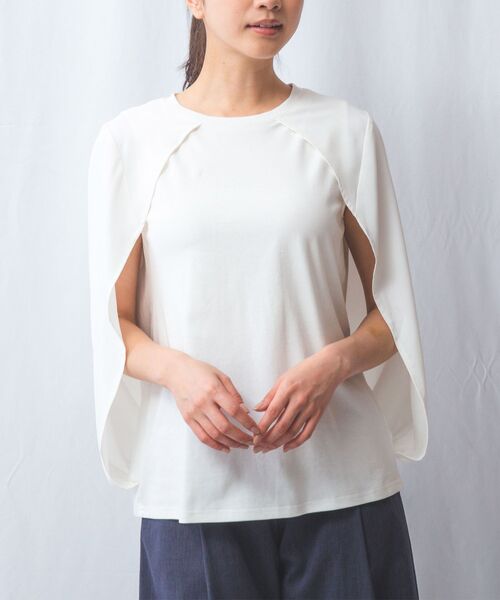 柔らかなマントシルエットがエレガントなムードを纏うデザインカットソー。マント部分はジョーゼット生地を使用したドレープの美しいシルエットに。身頃はカットソーで肌触りも良く快適に着用することができます。程よいボリューム感があり、気になるボディラインもさりげなくカバー。異素材を組み合わせたトレンド感のある1枚です。・ホワイト多少透け感あり・ストレッチあり・カラー展開はホワイト、ブラック・サイズ展開は1(M)9号・3(2L)13号