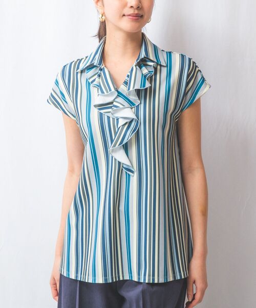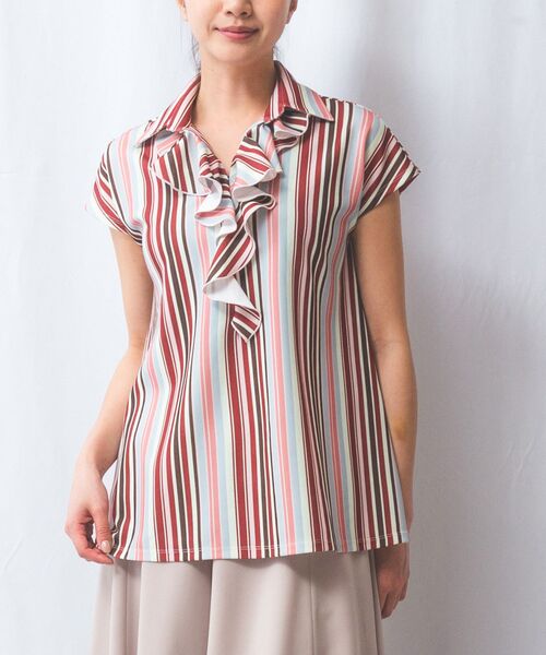 波打つフリルが目を惹く華やかなマルチストライプカットソー。夏の人気デザインに今年のプリントを載せました。鮮やかなマルチストライプが清涼感を漂わせ、シーズンムードも高まる1枚。スキッパーな襟付きデザインで甘すぎないエレガントな大人の装いを演出します。二の腕周りをカバーするフレンチライクなスリーブもポイント。仕事からプライベートにと、幅広いシーンにも活躍してくれるアイテムです。・透け感なし・ストレッチあり・カラー展開はレッド、ブルー・サイズ展開は1(M)9号・3(2L)13号