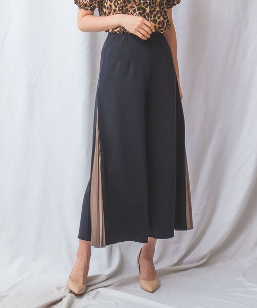 サイドのプリーツ切り替えが表情感のあるスタイリングを演出するパンツ。プリーツ部分は配色になっており、コーディネートのアクセント使いに大活躍してくれます。体型カバーも期待できるゆとりのあるシルエットがポイント。ウエスト周りにタックを寄せることで、上品なムードをプラスします。パンツでありながらスカートのように着こなせるエレガントなアイテムです。・カラー展開はブラック、ブラック×ブラック、ネイビー・サイズ展開は1(M)9号・3(2L)13号