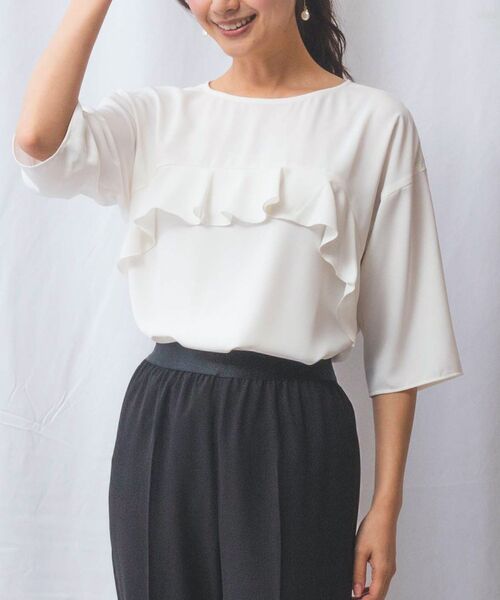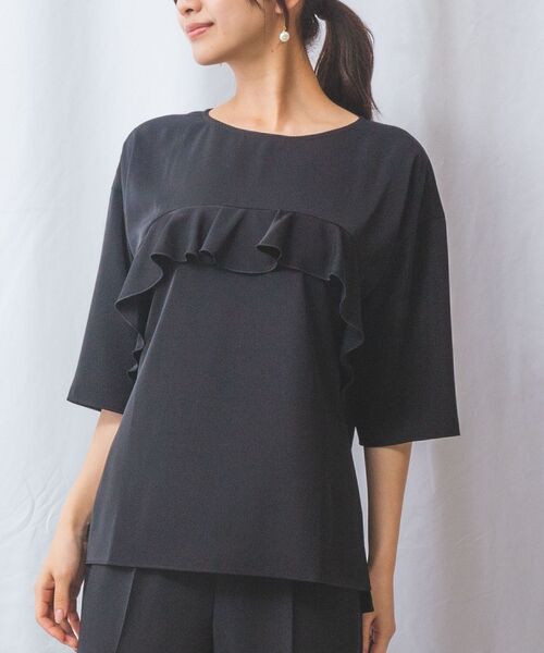 フロントフリルが華やかな表情を演出する七分袖プルオーバー。胸元からサイドにかけて流れるようにあしらったフリルがポイント。綺麗見えする軽やかなジョーゼット生地を使用しており、品よくスタイリングすることができます。サイドにスリットを加えた前後差ヘムで、抜け感のある軽やかな印象をプラス。シンプルながらも着映えするデザインで、コーディネートのポイントになる1着です。