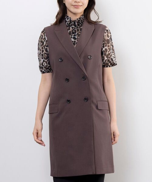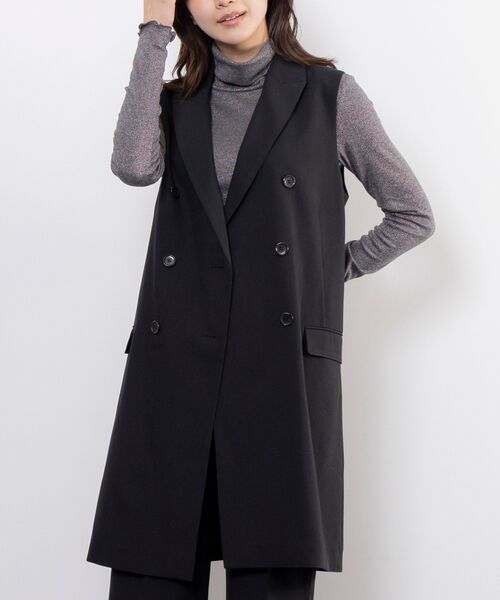 ストレートなシルエット、深めのVゾーンとダブルの打ち合わせがマスキュリンな印象を演出するロングジレ。ボタンとポケットの位置を高めにデザインし、スタイルアップ効果もプラスしています。背面にはスリットを施しており、さりげない抜け感を楽しむことができます。ダブルジャケットを合わせた時と同じスタイリングイメージを演出しながらも、ノースリーブの涼しさも兼ね備えた、初秋におすすめのアイテムです。・カラー展開はブラック、ブラウン・サイズ展開は1(M)9号・3(2L)13号