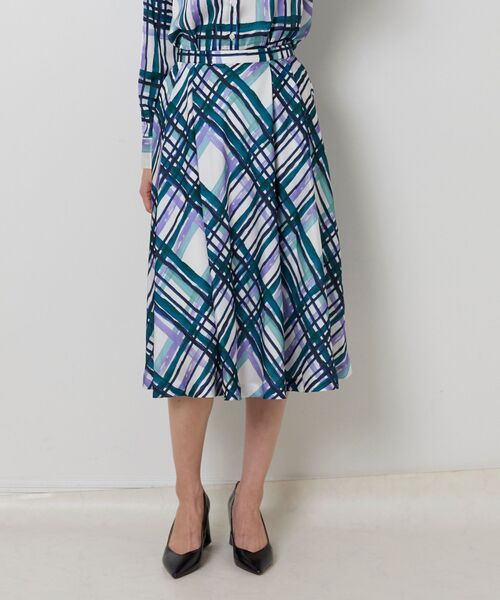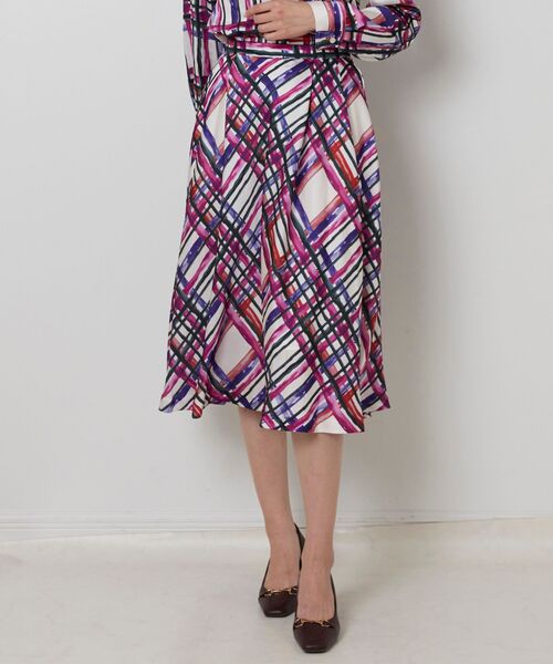 サテン素材のふわりと揺れるフレアシルエットが上品に見せるスカート。水彩画のような遊び心のあるチェック柄が目を引きます。ウエスト後部はゴム仕様で締めつけ感もなく、サイドファスナーにより着脱もノンストレス。シンプルなトップスと合わせるだけでもサマになり、同素材のトップス(30-52-01-912、30-52-01-913)とワンピース風に着こなすのもおすすめです。・カラー展開はグリーン、ピンク・サイズ展開は1(M)9号・3(2L)13号・4(3L)15号