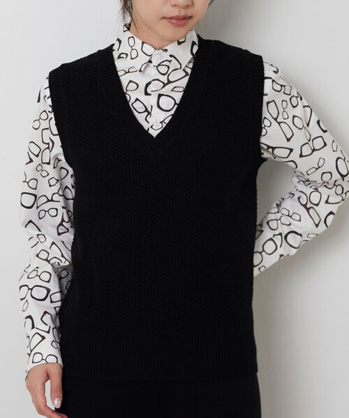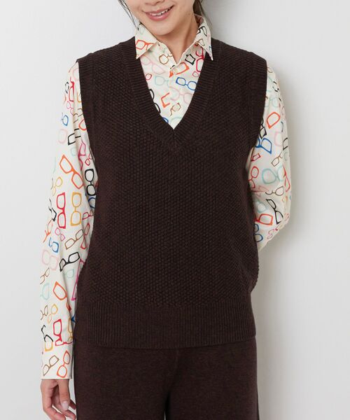 レトロブームに伴い、再び注目を集めるベーシックでオールドスタイルのニットベスト。メンズ感を抑えた深めのVネックが女性らしさをプラスし、襟元にデザインがあるインナーとの相性も抜群です。程よくフィット感のあるフォルムは、ボリュームのあるボトムスともバランスが取りやすく、同素材のボトムス(30-52-09-810)と合わせたオールインワン風スタイルもおすすめです。・カラー展開はブラック、ブラウン・サイズ展開は1(M)9号・3(2L)13号