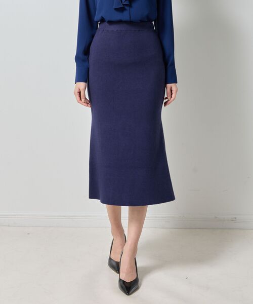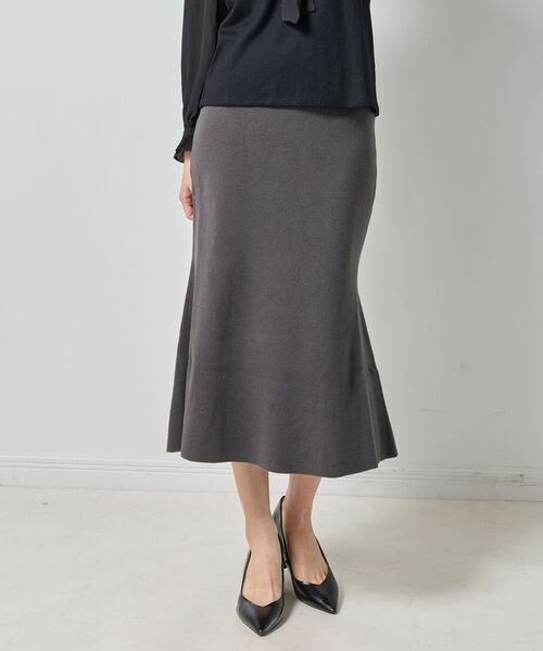 暖かくて動きやすいニット素材を、美しいマーメイドシルエットに仕上げたスカート。女性らしさを強調する程よいフィット感ながらも、縦長に魅せる絶妙なシルエットがスタイルアップにも効果的。合わせるトップスでカジュアルにもフェミニンにもスイッチでき、ファーやケープなどボリュームのあるアウターとの組み合わせも、コーディネートをすっきりと魅せる、今注目のアイテムです。・カラー展開はオフホワイト、グレー、ネイビー・サイズ展開は1(M)9号・3(2L)13号