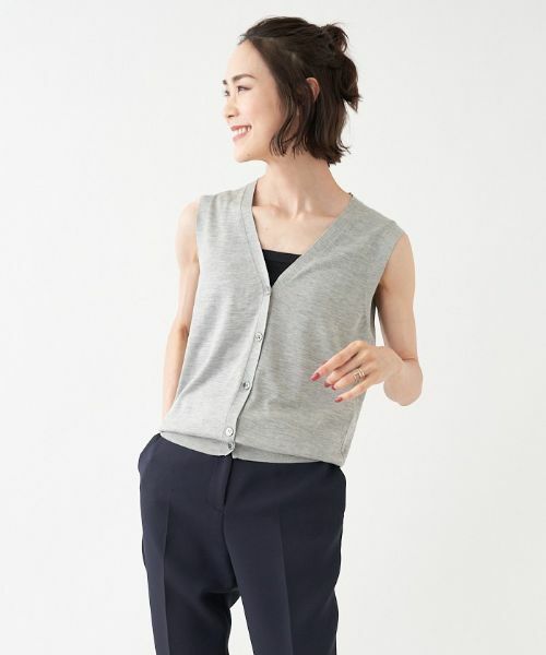 1枚着でもさまになるニットベスト。裾は細めにして、ボトムにインしてもすっきりと見えるデザインです。素材は、シルク/コットンを使用。シルク特有の上品な光沢とさらりとしたタッチが特徴です。※定価(税込)は、2021年05月28日のセール開始前の店舗における販売価格です。家庭洗濯不可漂白不可タンブル乾燥不可アイロン低温160℃まで石油系溶剤ドライクリーニング弱ウェットクリーニング不可