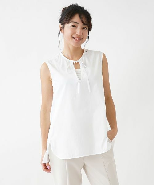 暑い季節も涼感たっぷりにスタイリングできる、コットン素材のノースリーブブラウス。ネックラインでキュッと結ばれた華奢なリボンが、さりげなく大人の可愛さを薫らせます。トレンドに左右されず、ほんのりイノセントなサマースタイルが楽しめる1枚。※定価(税込)は、2022年06月24日のセール開始前の店舗における販売価格です。