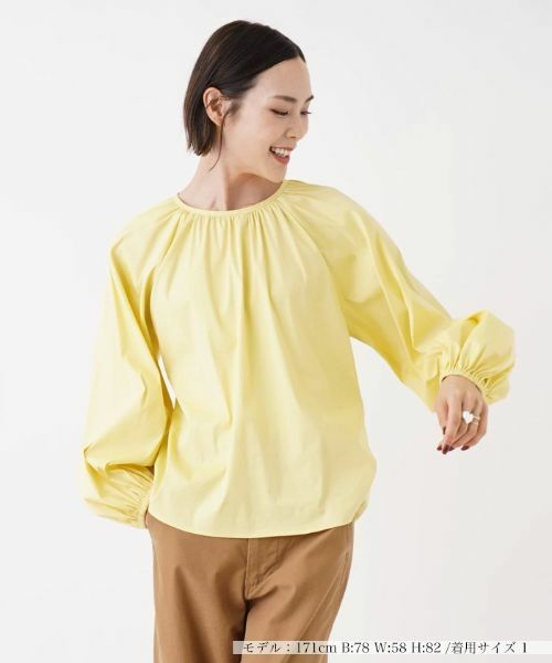ネックラインや袖口などにギャザーをたっぷりと入れ、ふんわり感を際立たせたフェミニンなブラウス。バックネックのドロップホールにはひと粒パールをあしらい、そっとエレガンスを投入しました。幅広いボトムスとさらりと合わせられる無地デザインでデイリーユースに活躍する一枚です。タイトスカートと合わせたキレイめなスタイルからパンツと合わせたカジュアルスタイルなど様々な着こなしが楽しめます。