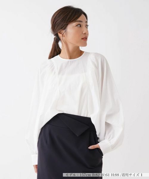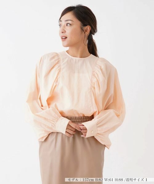 薄手のコットンベースのテキスタイルで清涼感をキープしたプルオーバーブラウス。たっぷりとギャザーを施したボリュームのあるスリーブが、大人の可愛さをを醸し出します。バックファスナー仕様でフロントの身頃は極力シンプルなデザインに仕上げました。タックインもアウトも決まるレングスで、パンツにもスカートにもマッチする1品。トレンド感と華やかさどちらも手に入るブラウスはクローゼットに1枚は追加しておきたいアイテムです。