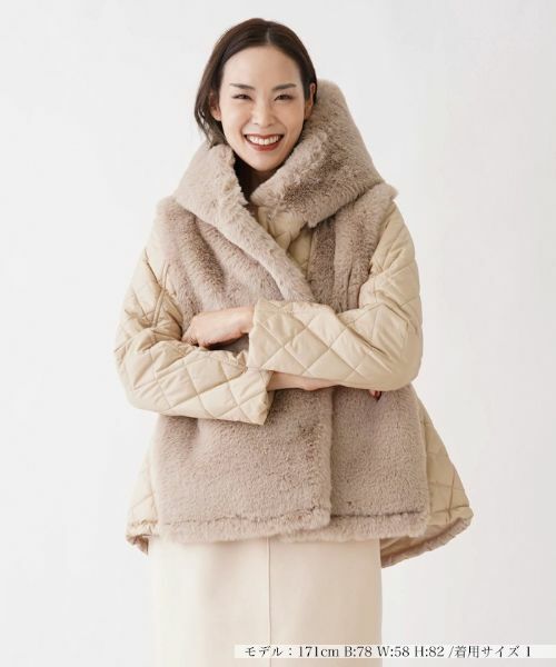 ふわふわのフェイクファーとキルティング生地を組み合わせた、異素材コンビのフーデッドジャケット。ビッグフードがインパクトを放ち、バックにゆったりとボリュームを持たせた変形シルエットで、ちょっぴりモードな雰囲気をキャッチ。フロントはスナップボタン仕様でスムーズに着脱可能。シンプルなニットとのレイヤードで、上級者のような技アリのコーディネートが楽しめるアウターです。