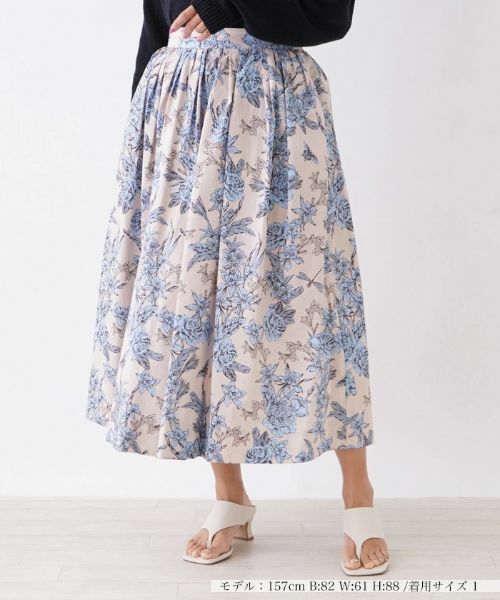 繊細に描かれたフラワープリントが華やかに広がるフレアロングスカート。ペールカラーの色使いも美しく、春夏シーズンらしい表情を見せてくれる一枚となっています。たっぷりとギャザーを入れ、柔らかなニュアンスに仕上げました。同デザインのブラウスとコーディネートすれば、よりお洒落な雰囲気の着こなしが楽しめます。サイドファスナーあり。