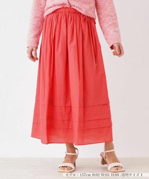 ふんわりと広がるボリューム感溢れるシルエットが印象的なロング丈のフレアスカート。流れるようなギャザーをたっぷりと施し、裾周りにはボーダー状に生地を重ねることで独特な表情を生み出しています。コットン×ナイロンの軽やかな風合いの生地感がこれからの季節にぴったりの一枚です。総ゴム仕様のウエストはドローストリングにより調整が可能。
